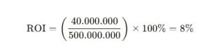 ROI=(Keuntungan BersihTotal Investasi)×100%\text{ROI} = \left( \frac{\text{Keuntungan Bersih}}{\text{Total Investasi}} \right) \times 100\%
